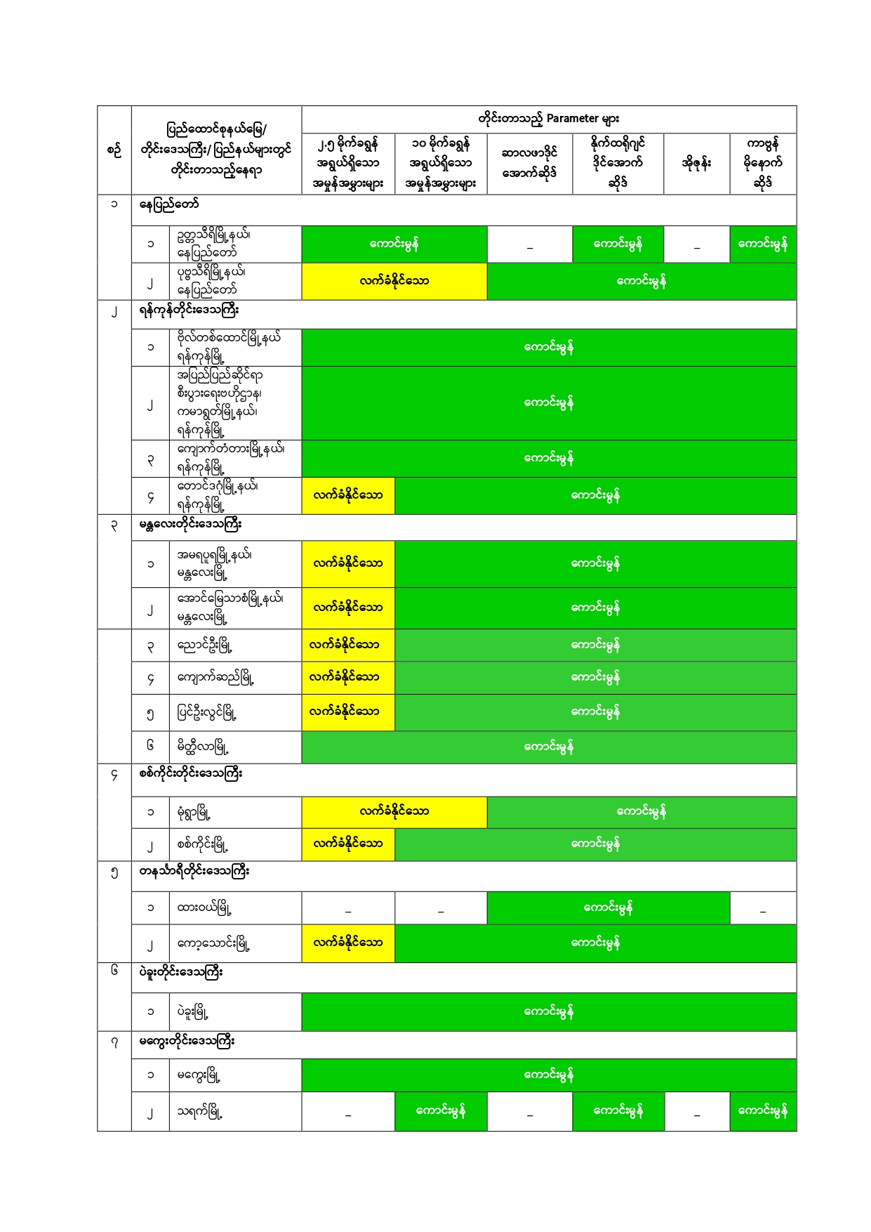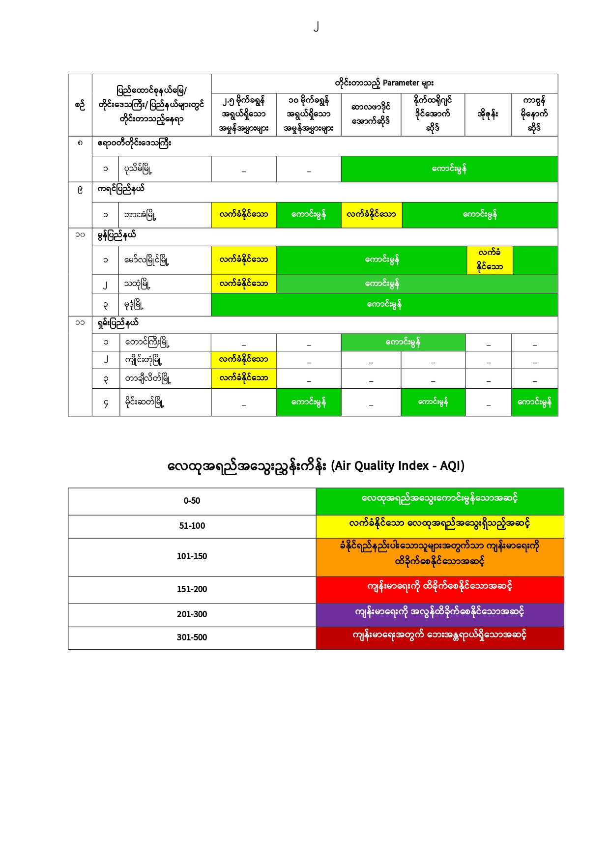 မြန်မာနိုင်ငံတစ်ဝှမ်းရှိ ဝန်းကျင်လေထုအရည်အသွေးအခြေအနေအား လေ့လာဆန်းစစ် နိုင်ရန်အတွက် ပတ်ဝန်းကျင်ထိန်းသိမ်းရေးဦးစီးဌာနအနေဖြင့် ပြည်ထောင်စုနယ်မြေ/ တိုင်းဒေသကြီး/ ပြည်နယ်များရှိ သတ်မှတ် Sampling Point နေရာများတွင် ဝန်းကျင် လေထုအရည်အသွေးကို Environmental Perimeter Air Station (EPAS) – Haz-Scanner၊ Air Quality Monitoring Station (AQM-65)၊ Scentroid (SL – 50 Scential)၊ Aeroqual (Series – 500 Portable Air Quality Monitor)၊ AQMesh (Dust Analyzer – 1941150)၊ (Gas Analyzer – 1940150)၊ Portable Beta Attenuation Mass Monitor (BAM 1022)၊ Air Quality Monitoring Station (AQMS) နှင့် Continuous Particulate Monitor များအသုံးပြု၍ Particulate Matter 2.5 (PM2.5)၊ Particulate Matter 10 (PM10)၊ Sulphur Dioxide (SO2) ၊ Nitrogen Dioxide (NO2)၊ Ozone (O3) နှင့် Carbon Monoxide (CO) စသည့် အဓိက Parameter များကို ပုံမှန်တိုင်းတာပြီး လေ့လာဆန်းစစ်လျက်ရှိပါသည်။